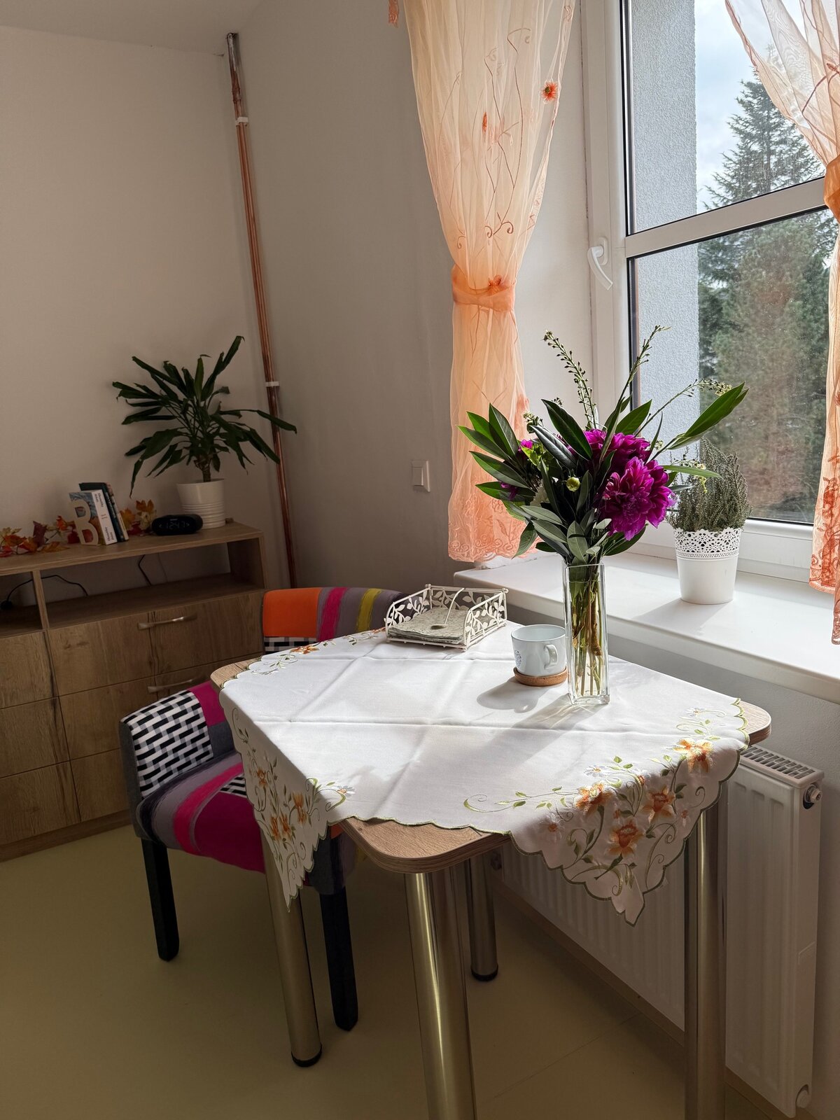 Do cíle nám ale ještě zbývá pár kroků. Je třeba dokončit vybavení nábytkem a dalším zařízením, aby mohl být provoz skutečně zahájen. Jeden zhotovitel už svou práci uzavírá, druhý naplno pilně pracuje. Před budovou je stále čilý ruch – probíhají práce na kanalizaci a okolním terénu.