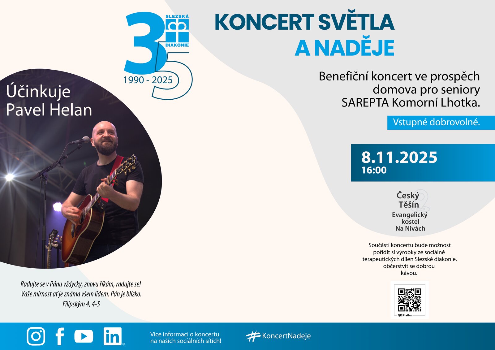 Srdečně Vás zveme na benefiční koncert k 35. výročí Slezské diakonie s názvem Koncert Světla a naděje. Přijďte si užít dobrou hudbu a podpořit dobrou věc.