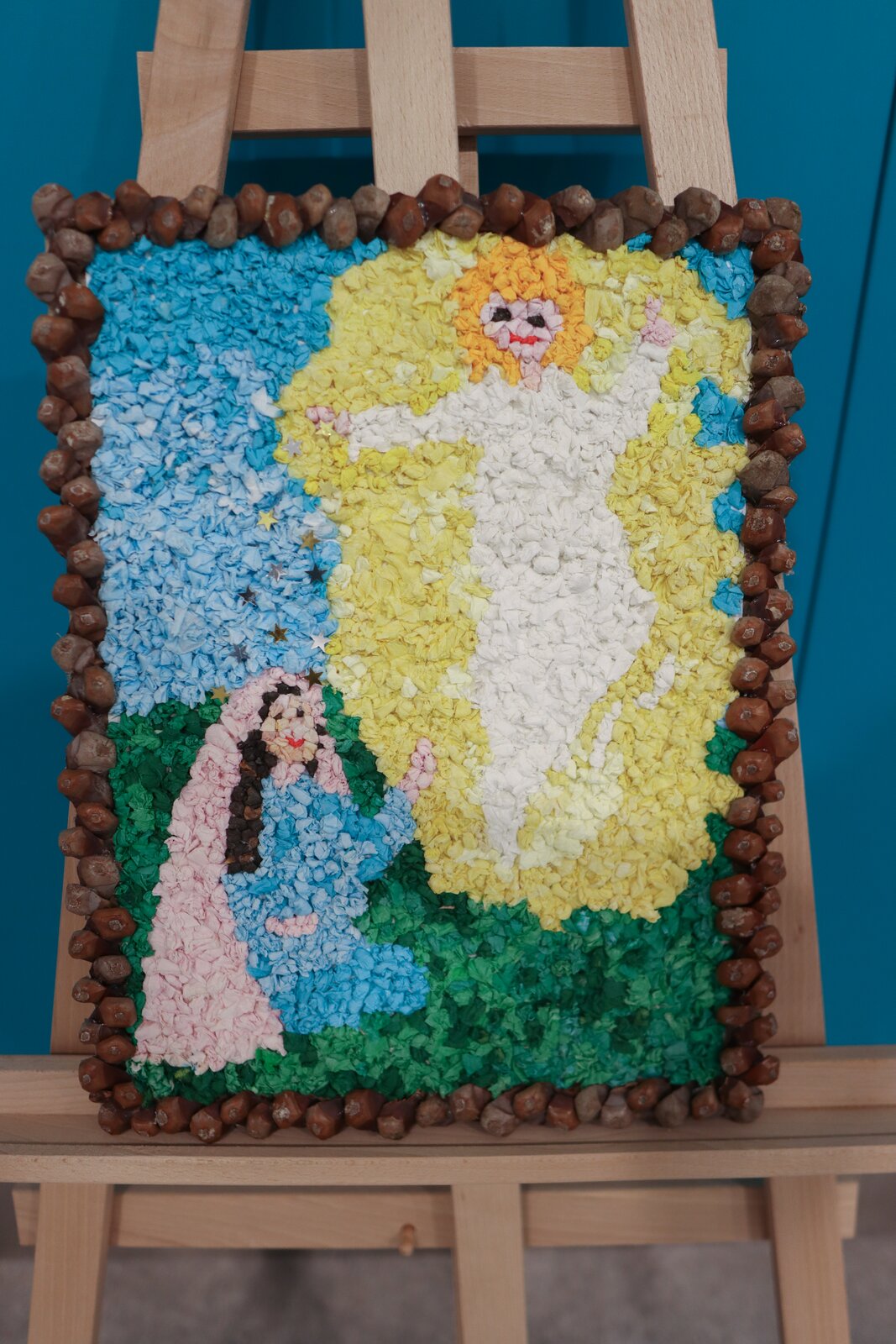 Jedna klientka je z pobytové služby DUHOVÝ DŮM Ostrava 🏠. Její obraz povolání Marie je barevný, udělaný z ruliček papíru.