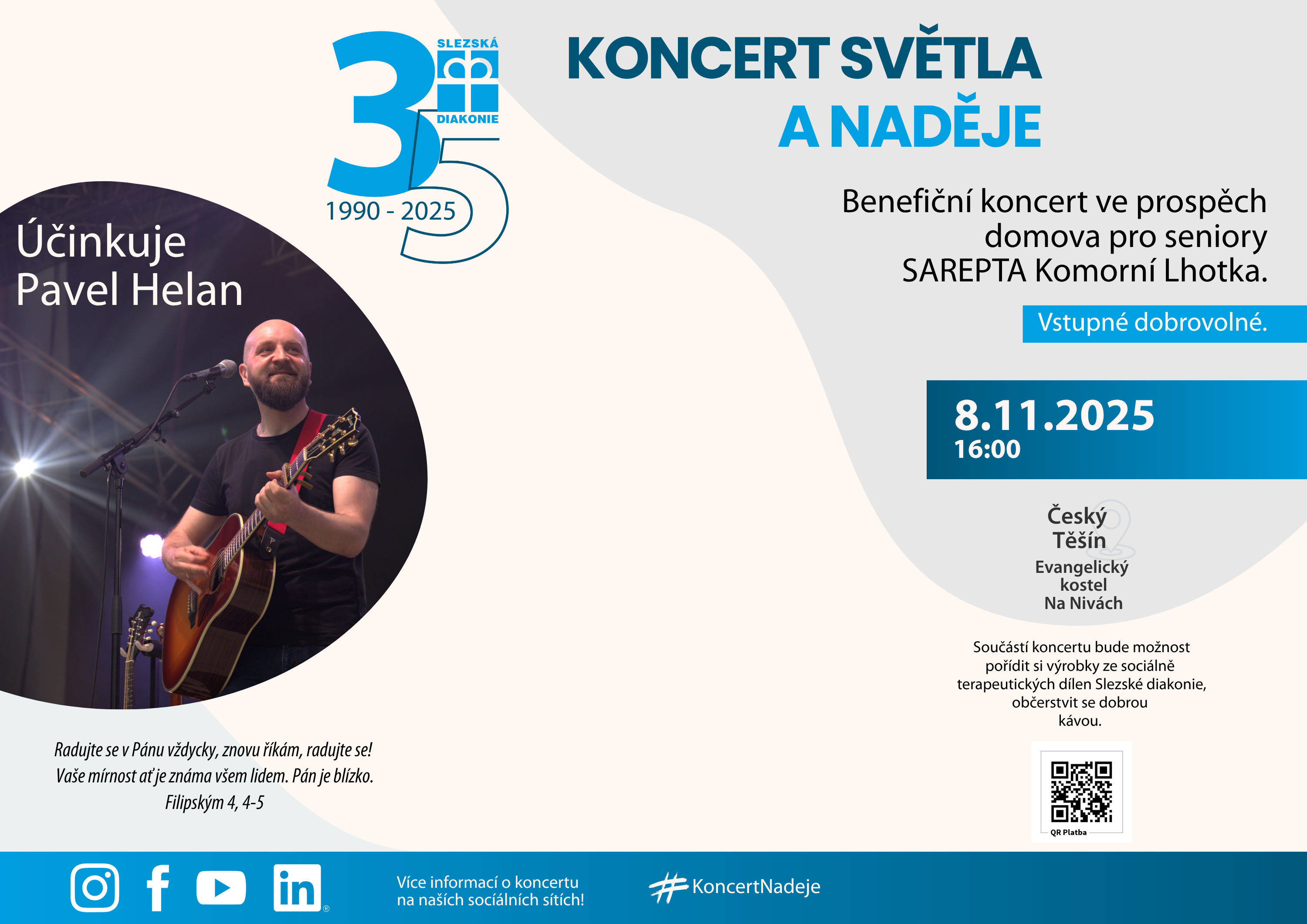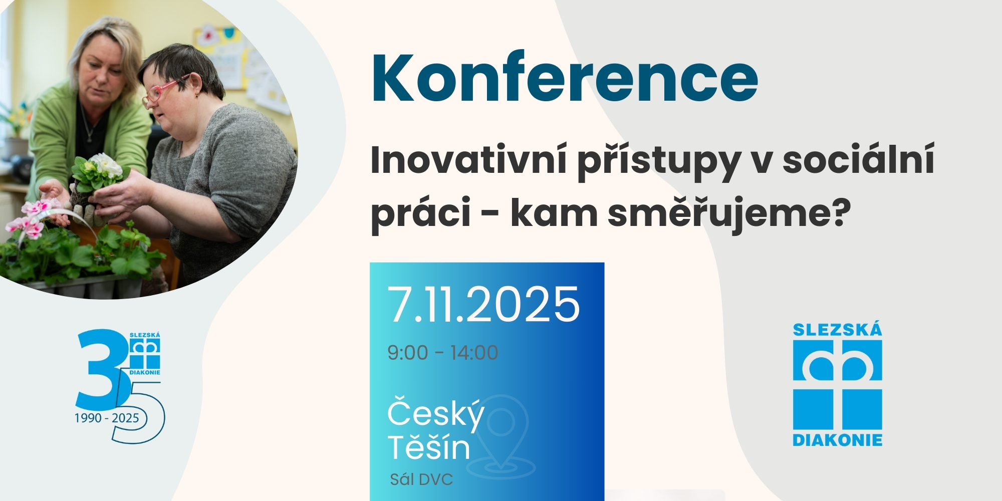 Ve Slezské diakonii si v roce 2025 připomínáme 35. výročí našeho působení. Při této příležitosti pořádáme v listopadu konferenci ke kvalitě služeb na téma inovativní přístupy v sociální oblasti - kam směřujeme, Koncert světla a naděje a bohoslužbu. Po celý rok realizujeme kampaň POVOLÁNÍ, kdy přinášíme informace o povolání v sociálních službách ve dvou rovinách. Komunikujeme hlavní pracovní pozice ve smyslu povolání jako profese, ale rovněž i ve smyslu celoživotního závazku čímž rozumíme poslání.