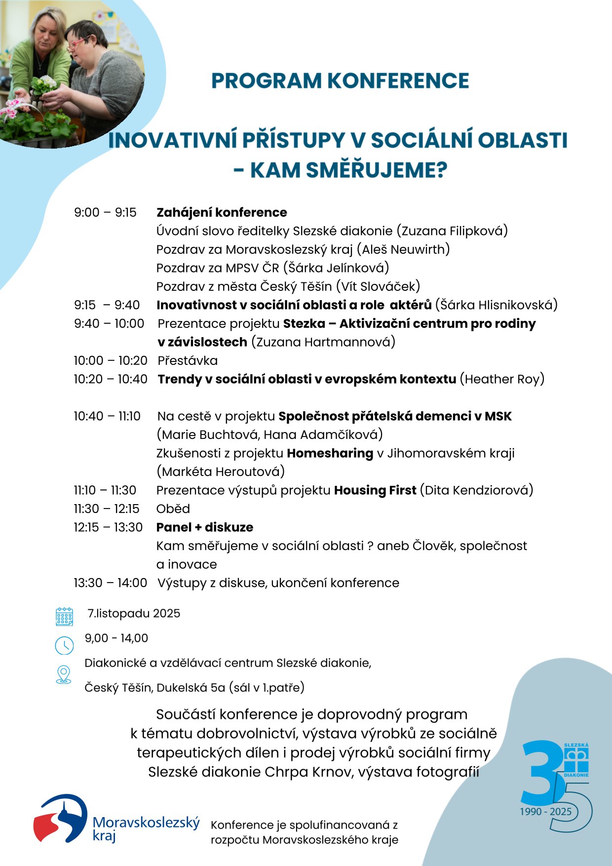 Součástí konference je doprovodný program k tématu dobrovolnictví, výstava výrobků ze sociálně terapeutických dílen i prodej výrobků sociální firmy Slezské diakonie Chrpa Krnov, výstava fotografií